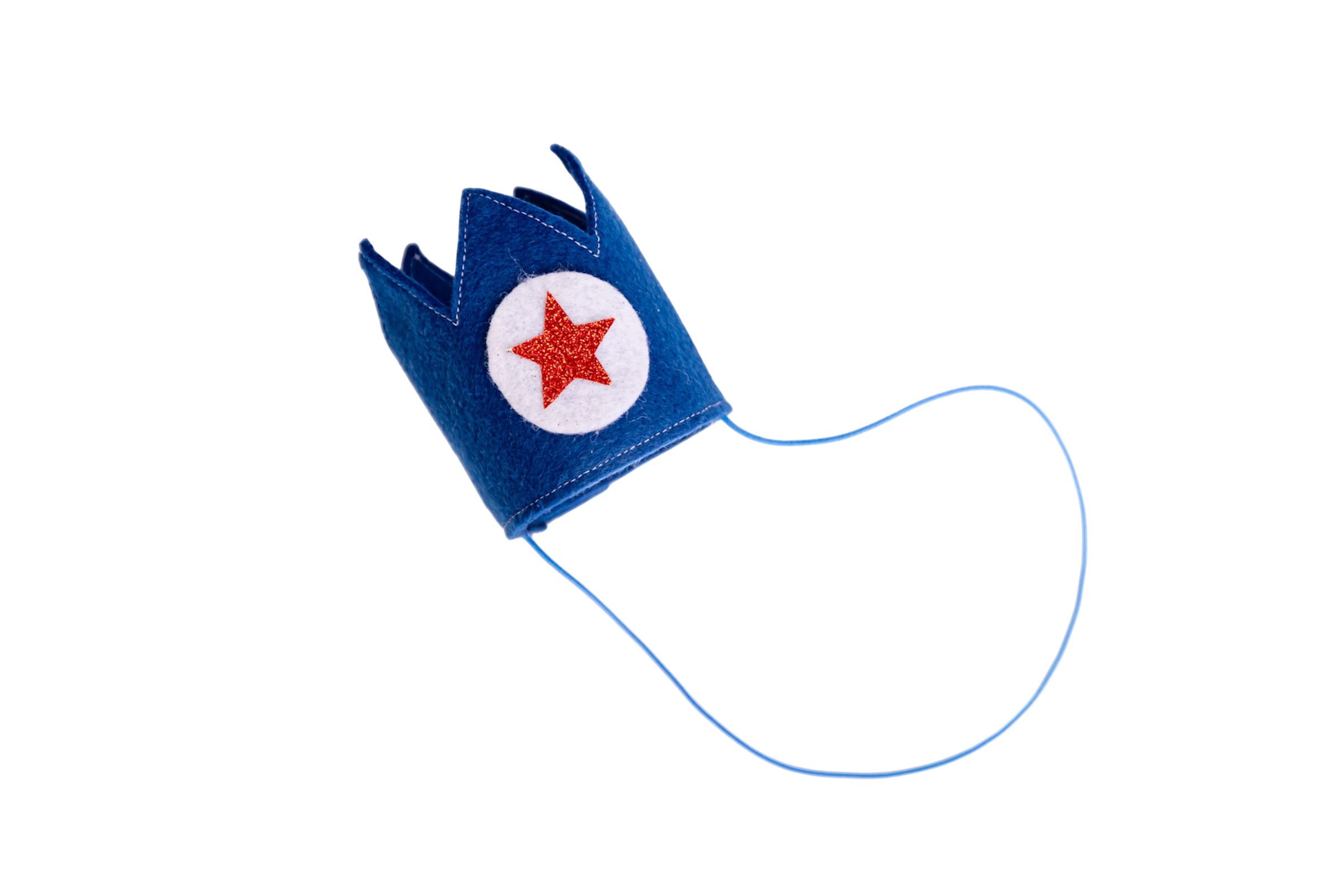 Corona de fieltro en color azul intenso, con un detalle central de estrella roja con glitter sobre fondo blanco. Un diseño alegre y lleno de energía para que tu peque brille en su día especial.