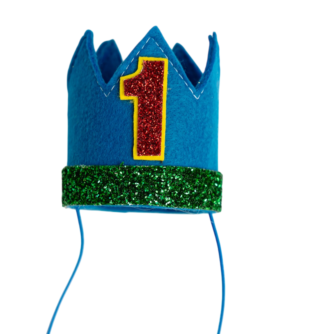 Corona de fieltro azul con detalle de número 1 en diamantina color rojo y borde verde en diamantina.
